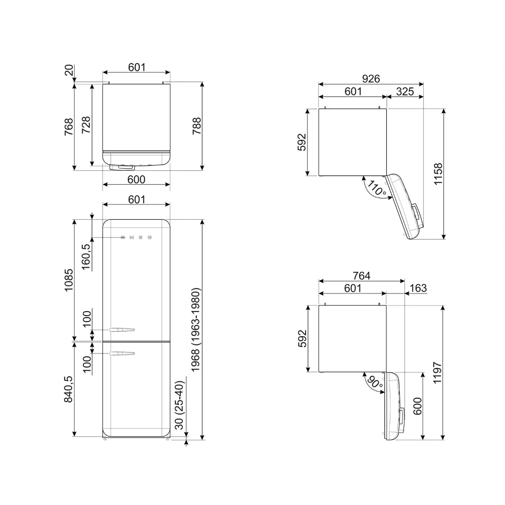Dimensões exteriores (AxLxP): 1968 x 601 x 728 mm.