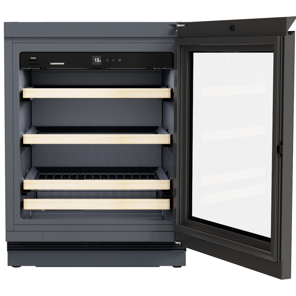 Filtro de carvão ativado FreshAir: Presente em todas as garrafeiras Liebherr para neutralizar odores e manter o bouquet puro do vinho. Um lembrete de troca aparece a cada 6 meses, garantindo a sua eficácia.