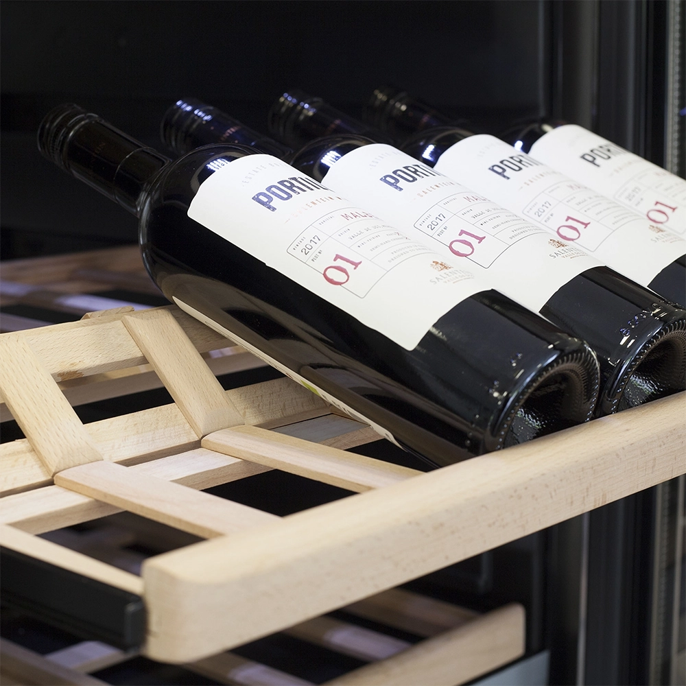 Sete prateleiras de madeira (seis delas com extensões de rolamento de esferas) incl. aquele com dispositivo para apresentar seus melhores vinhos