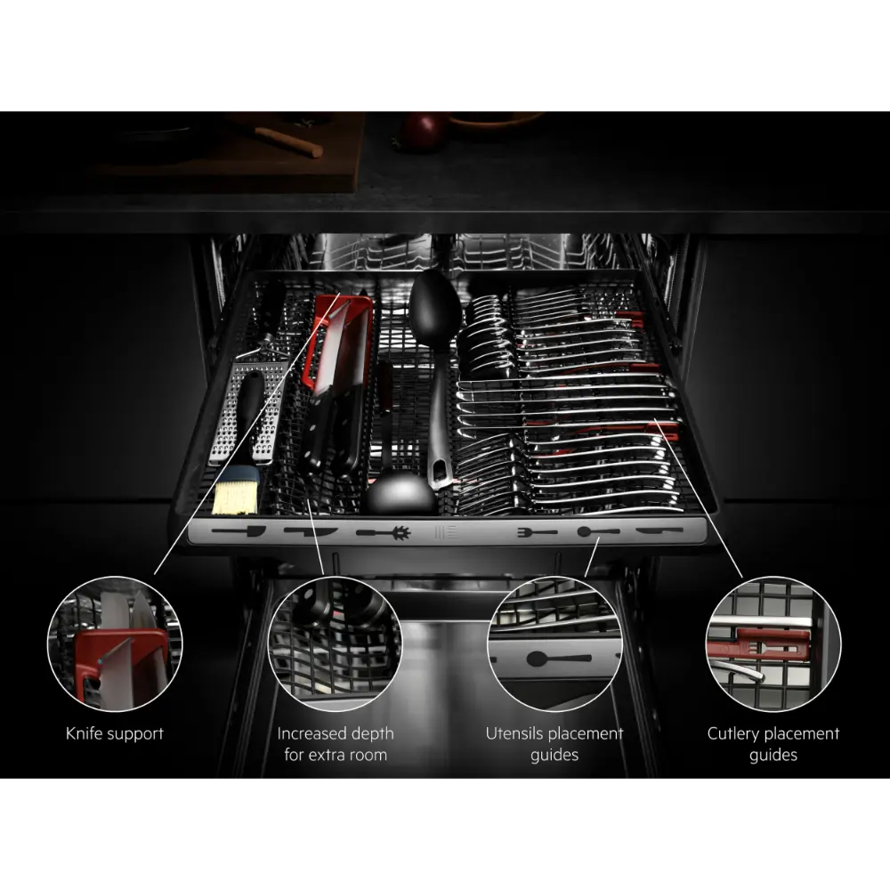Opções cesto superior: 6 Soft grips para copos de vinho, 2 prateleiras rebatíveis, 2 prateleiras rebatíveis para copos, 2 Soft Splikes, Suporte rebatível para chávenas, Cabo em aço inoxidável AEG