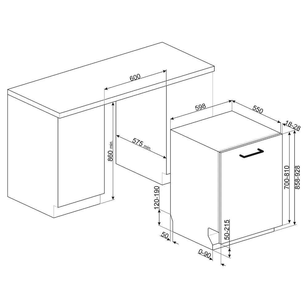 Largura: 598 mm. Profundidade: 550 mm. Altura: 858 mm. Profundidade da máquina com porta aberta: 1168 mm.