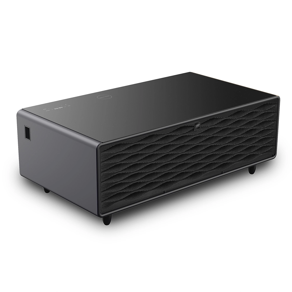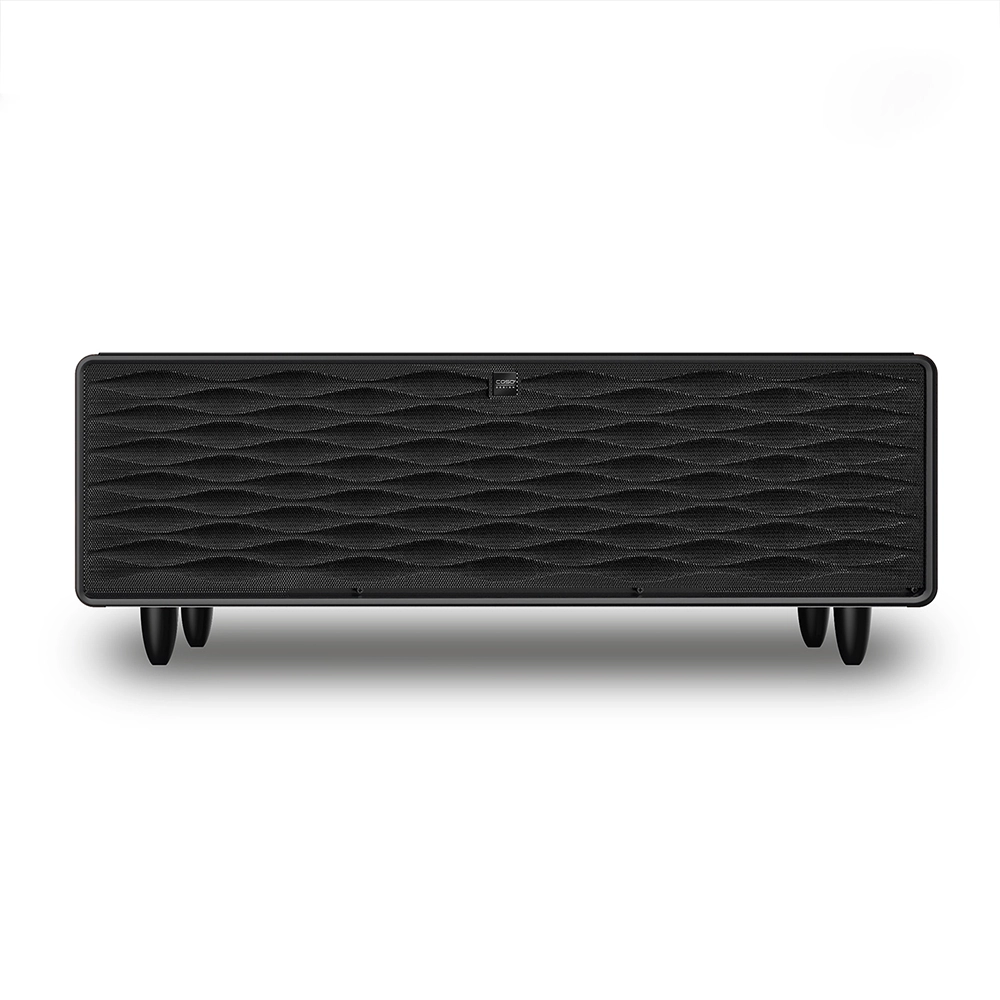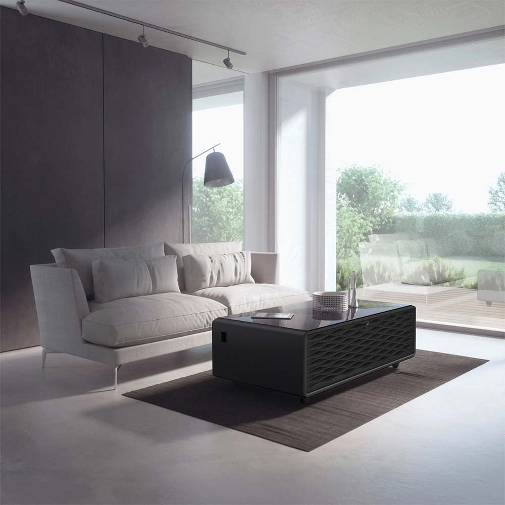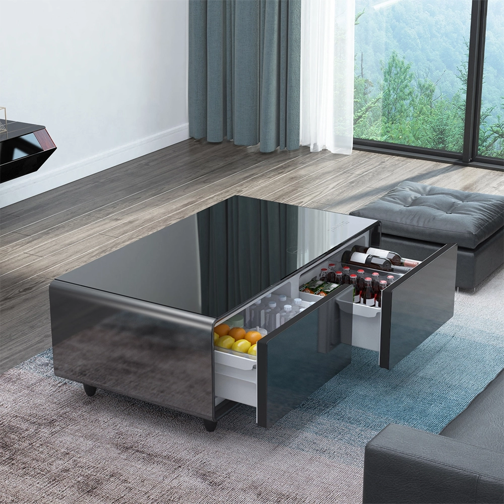Mesa de estar com compartimentos de refrigeração, alto-falantes de música integrados e opção de carregamento para smartphones, etc.