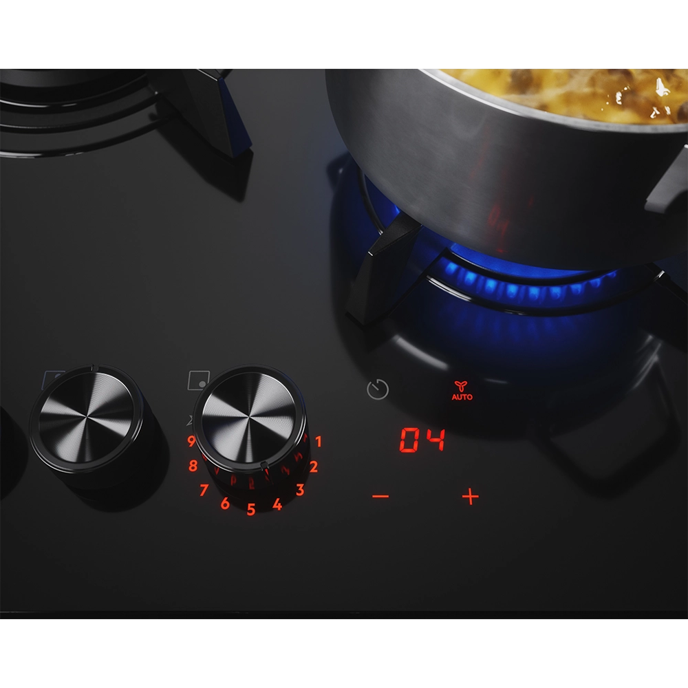 Série 8000 FlameLight, 75 cm, 5 queimadores: 4 SpeedBurner + 1 Wok, CoComandos SeptPower (9 níveis) com LED, Temporizador com Sinal acústico, Grelhas de ferro fundido, Sistema de segurança