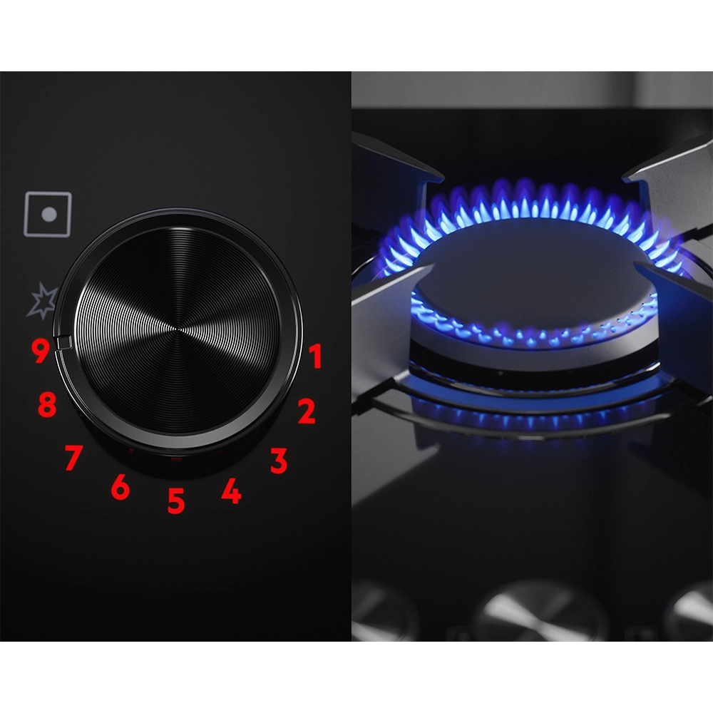 Série 8000 FlameLight, 90 cm, 5 queimadores: 4 SpeedBurner + 1 Wok, CoComandos SeptPower (9 níveis) com LED, Temporizador com Sinal acústico, Grelhas de ferro fundido, Sistema de segurança