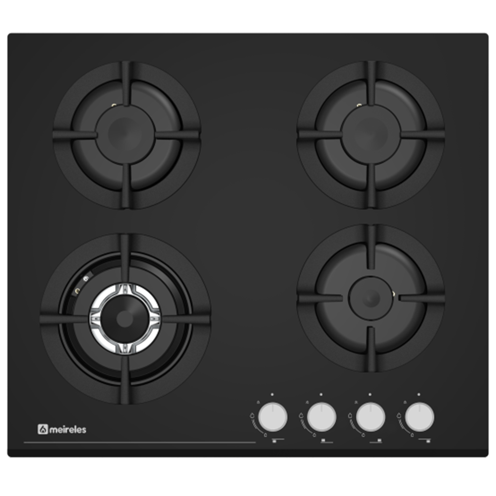 Placa cristal gás com 60cm – 4 queimadores a gás de alta eficiência – Queimador wok – Acendimento – Válvulas de segurança – Grelhas em ferro fundido