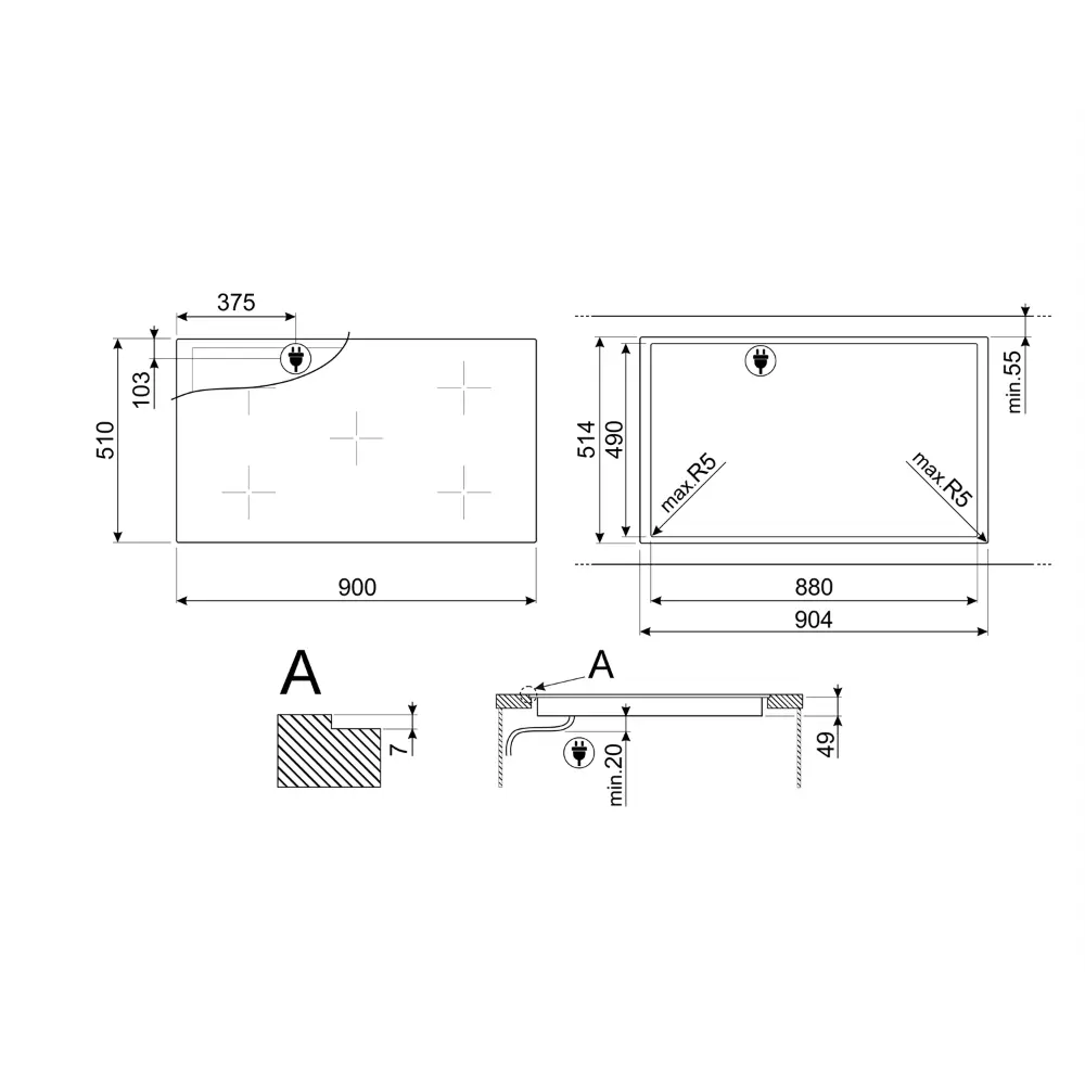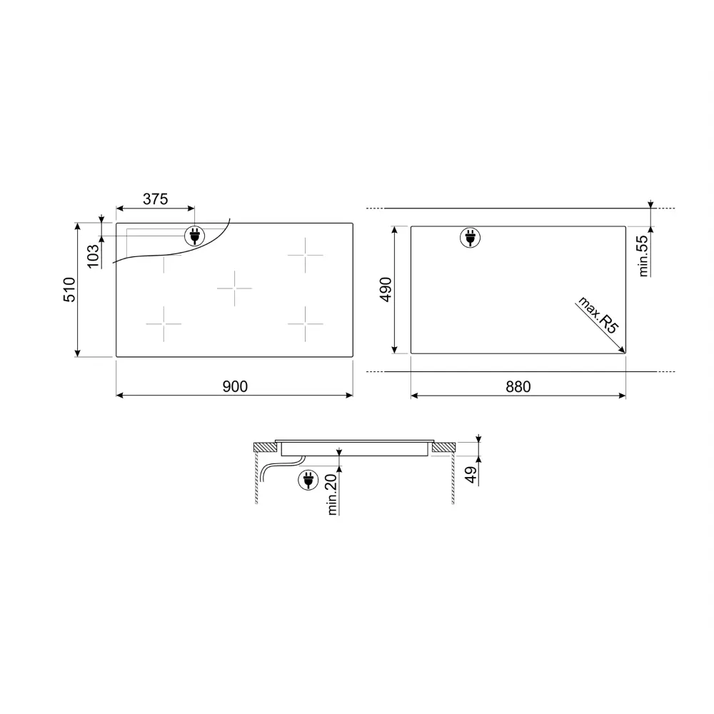 Dimensões de corte (LxP): 880 x 490 mm.