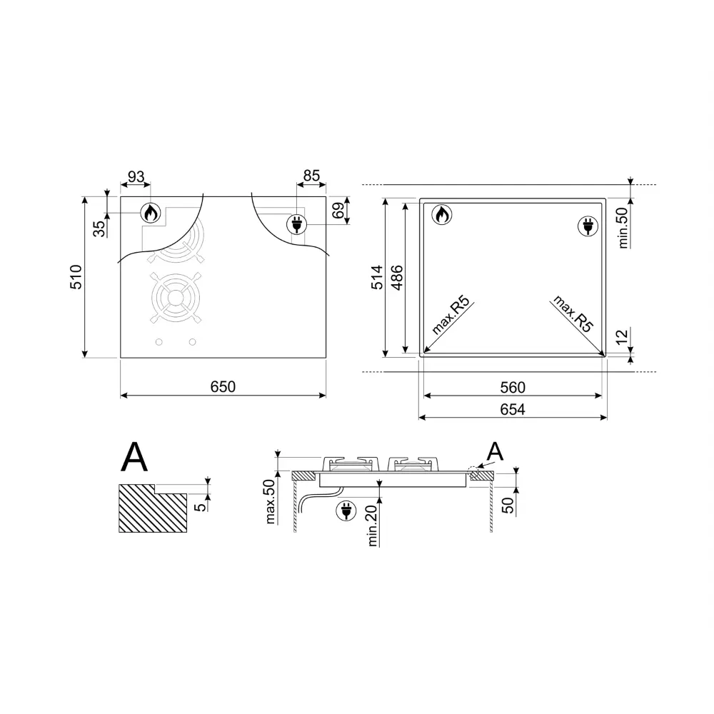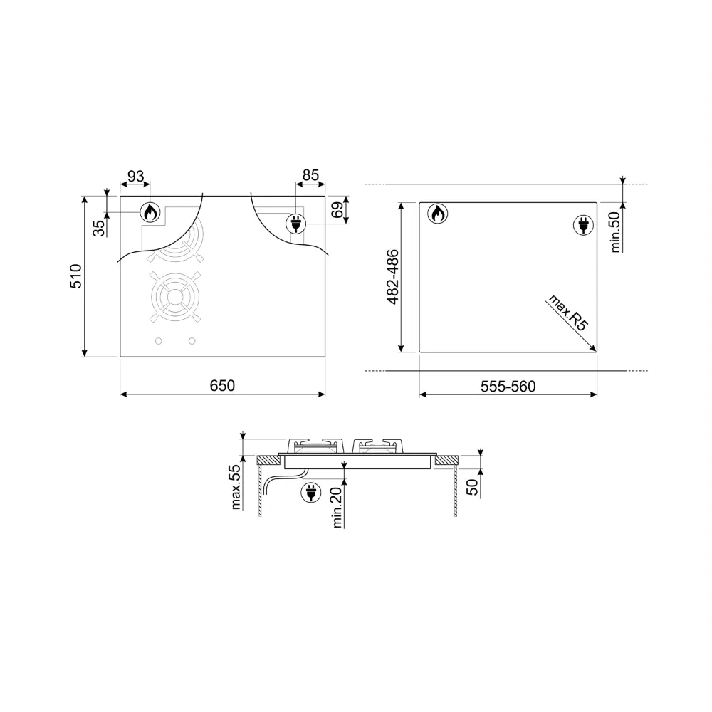 Corte na pedra: 482-486 x 560-564 mm.