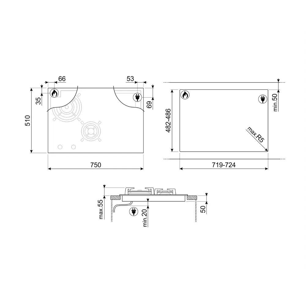 Placa Mista Smeg DNS (Indução e Gás) – 75cm – Vidro Preto – PM6743R
