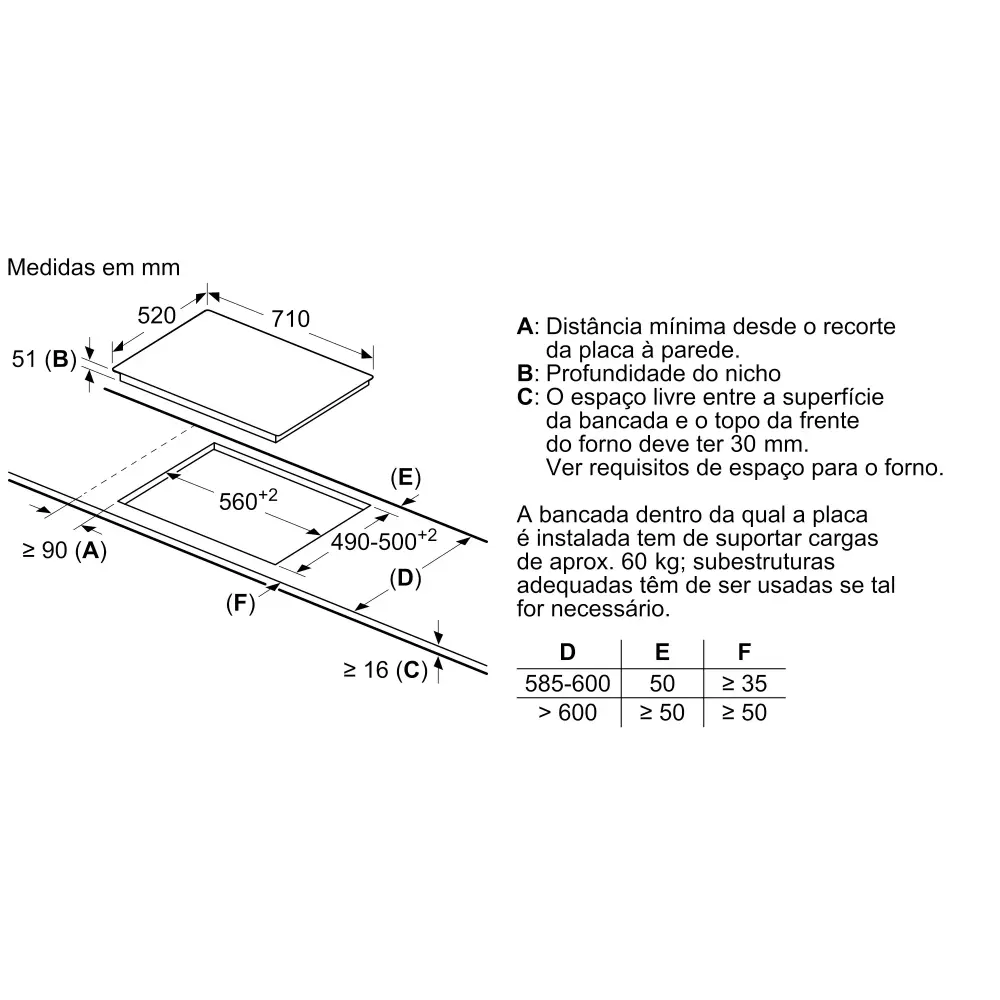 Dimensões do nicho para instalação (AxLxP): 51 x 560 x 490-500 mm.