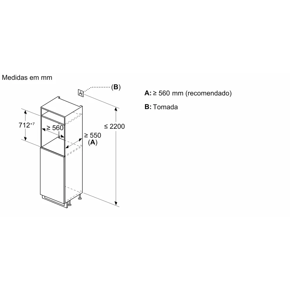 Dimensões do nicho para instalação (AxLxP): 720 x 560 x 550 mm.